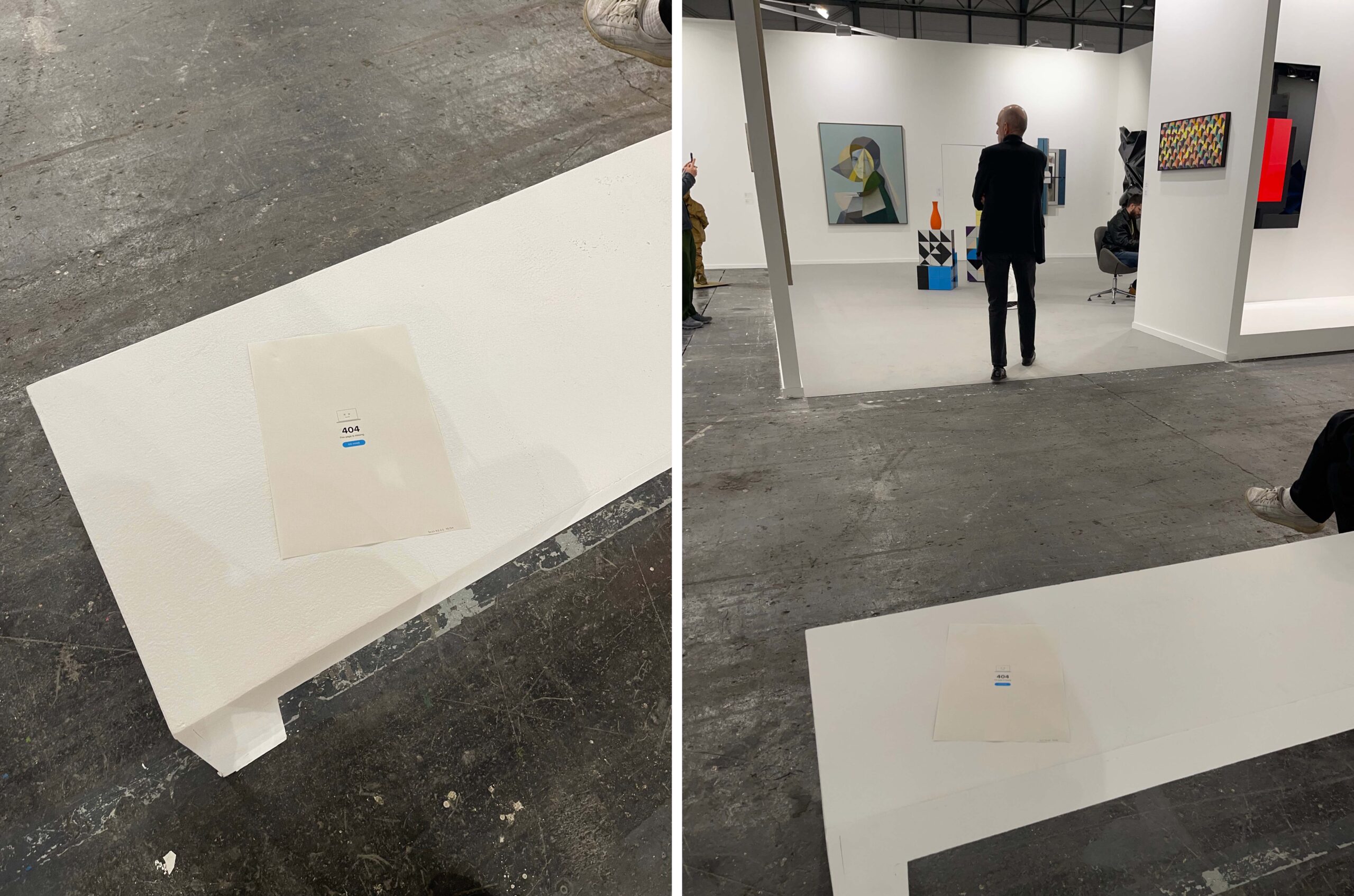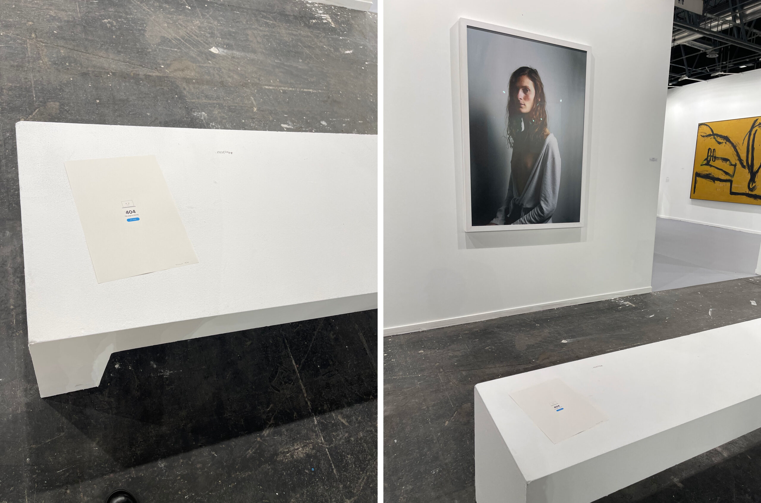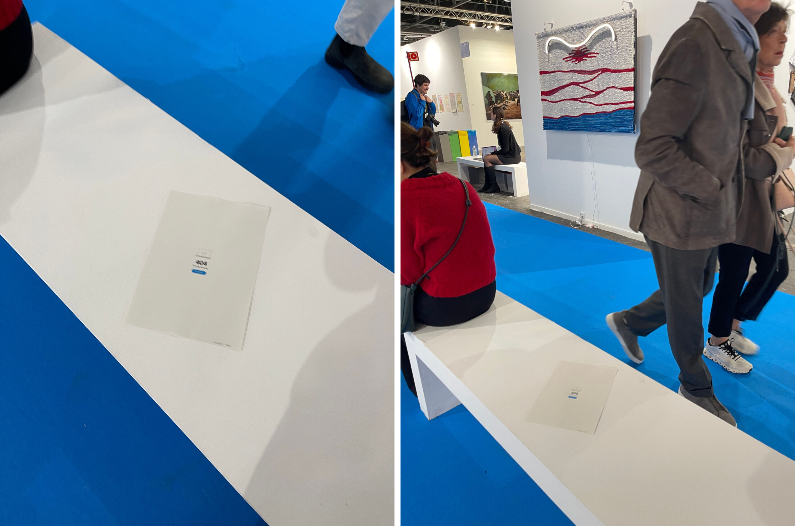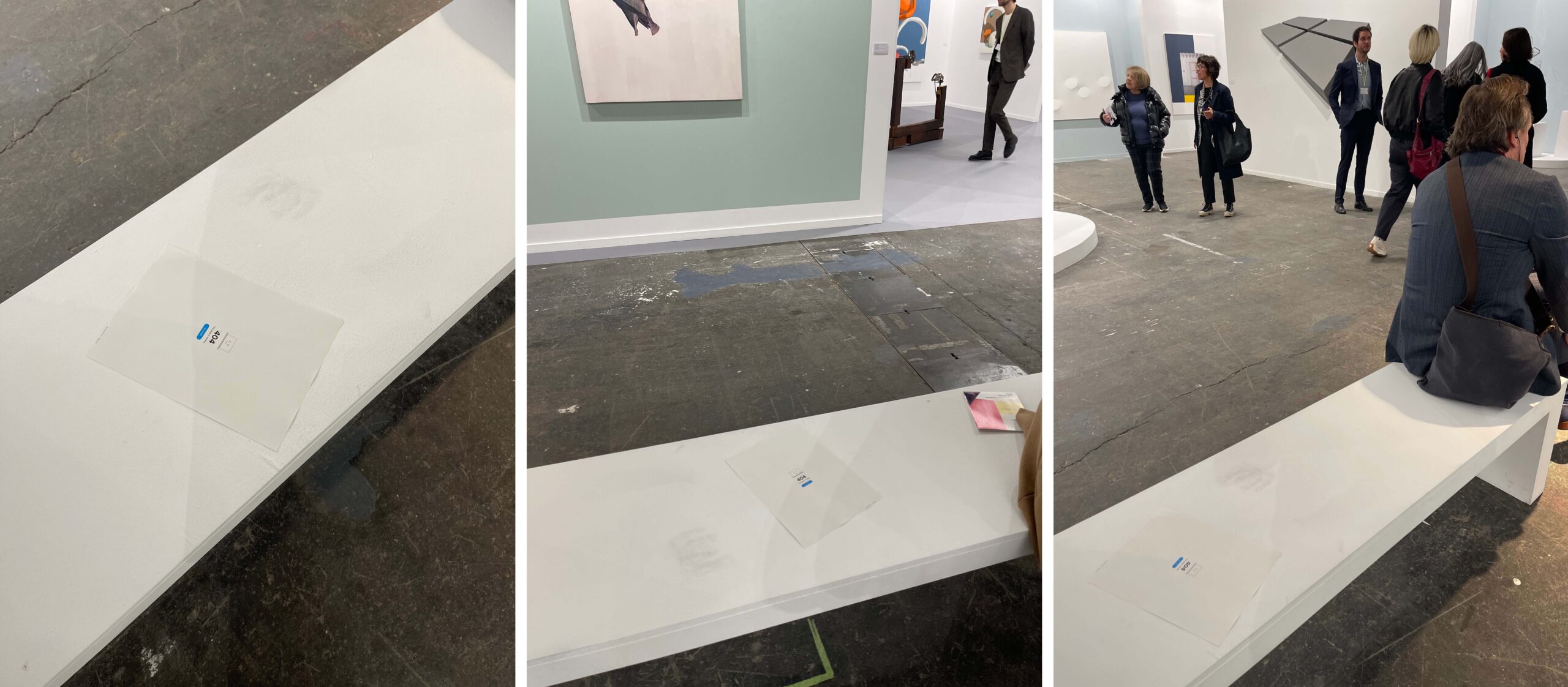 On February 22nd, as soon as ARCO opened at 11 am, I entered Pavilion 9 and began placing the 20 prints on benches in the aisles and in the storage area of some galleries. I did it as an installation, providing enough space so that two sheets were not visible from the same point. It could also be said that I left them like other people leave forgotten papers. I did the same in Pavilion 7. As I did it, I photographed, as a record, all the sheets left to their fate, the complete edition except for the 5 artist’s copies. I took photos with a close-up of the