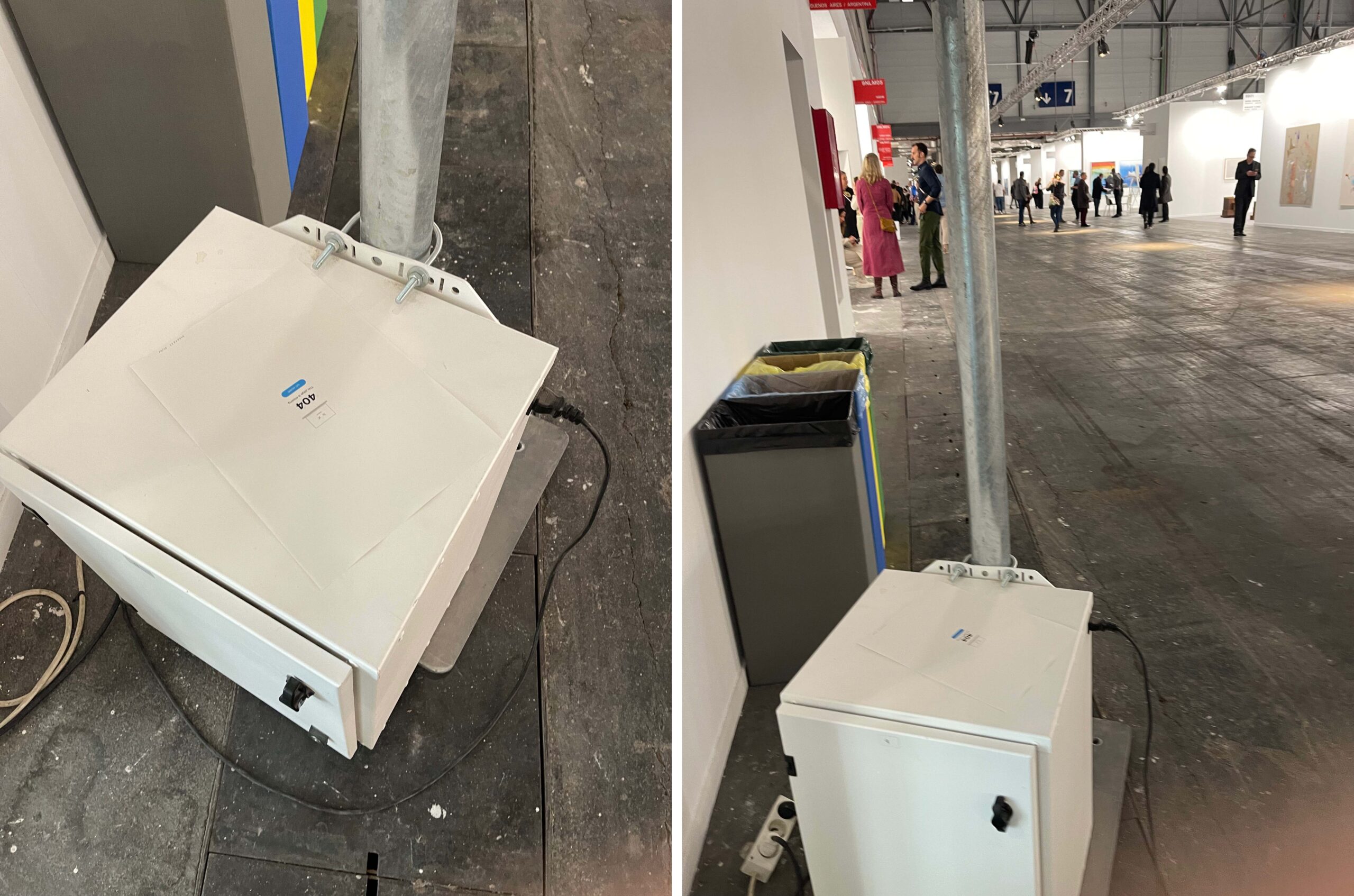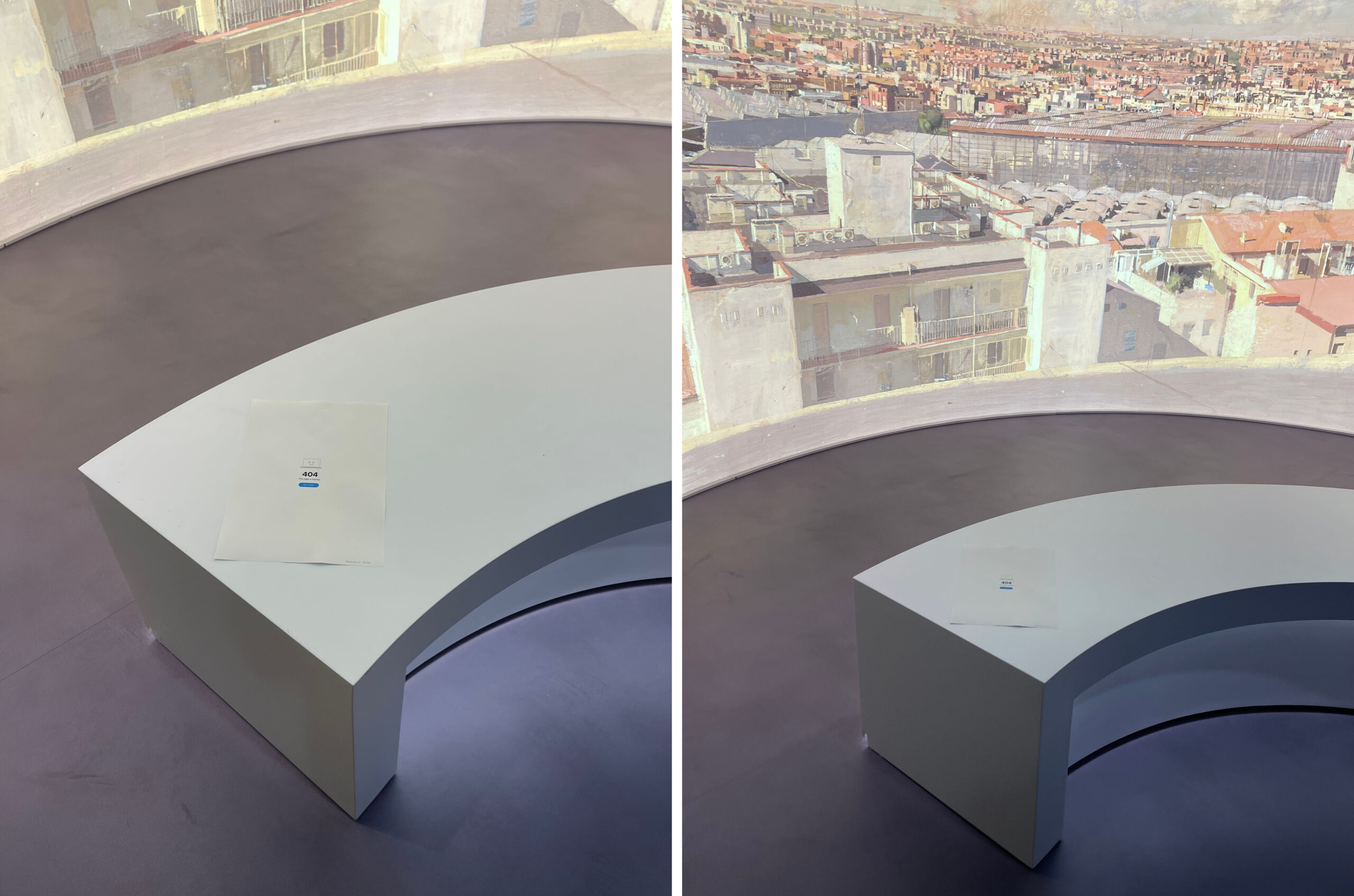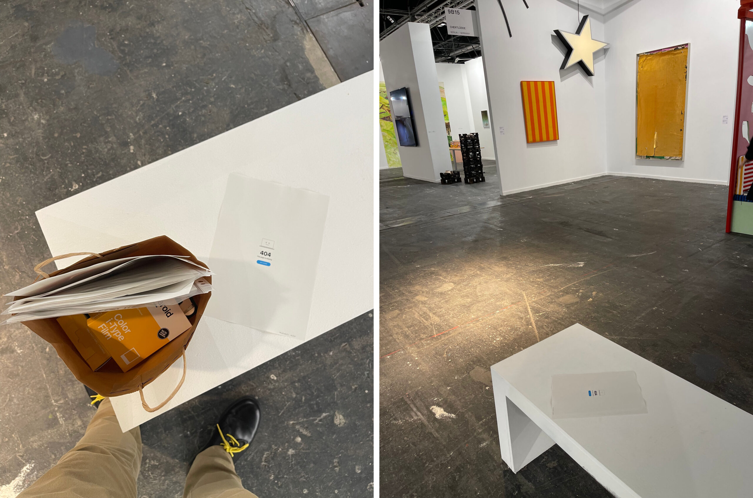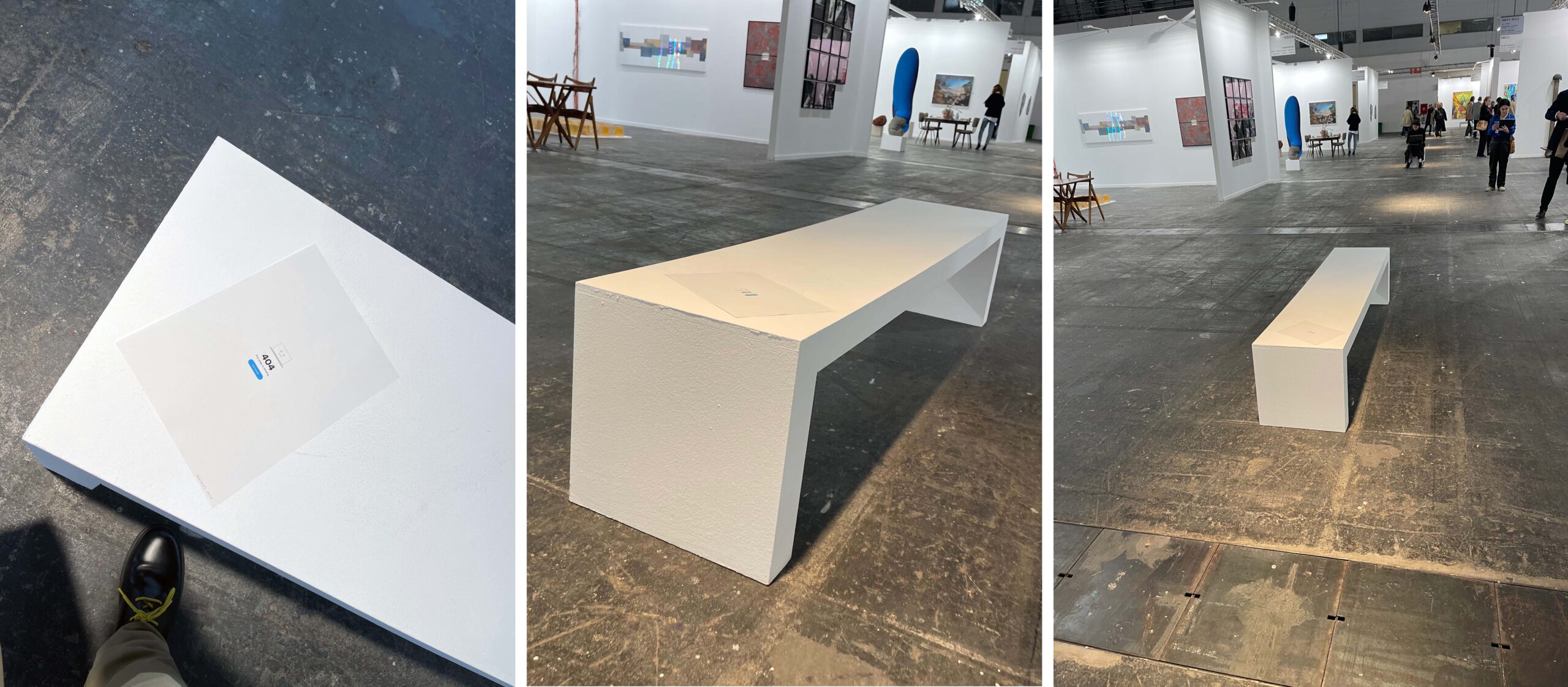 On February 22nd, as soon as ARCO opened at 11 am, I entered Pavilion 9 and began placing the 20 prints on benches in the aisles and in the storage area of some galleries. I did it as an installation, providing enough space so that two sheets were not visible from the same point. It could also be said that I left them like other people leave forgotten papers. I did the same in Pavilion 7. As I did it, I photographed, as a record, all the sheets left to their fate, the complete edition except for the 5 artist’s copies. I took photos with a close-up of the