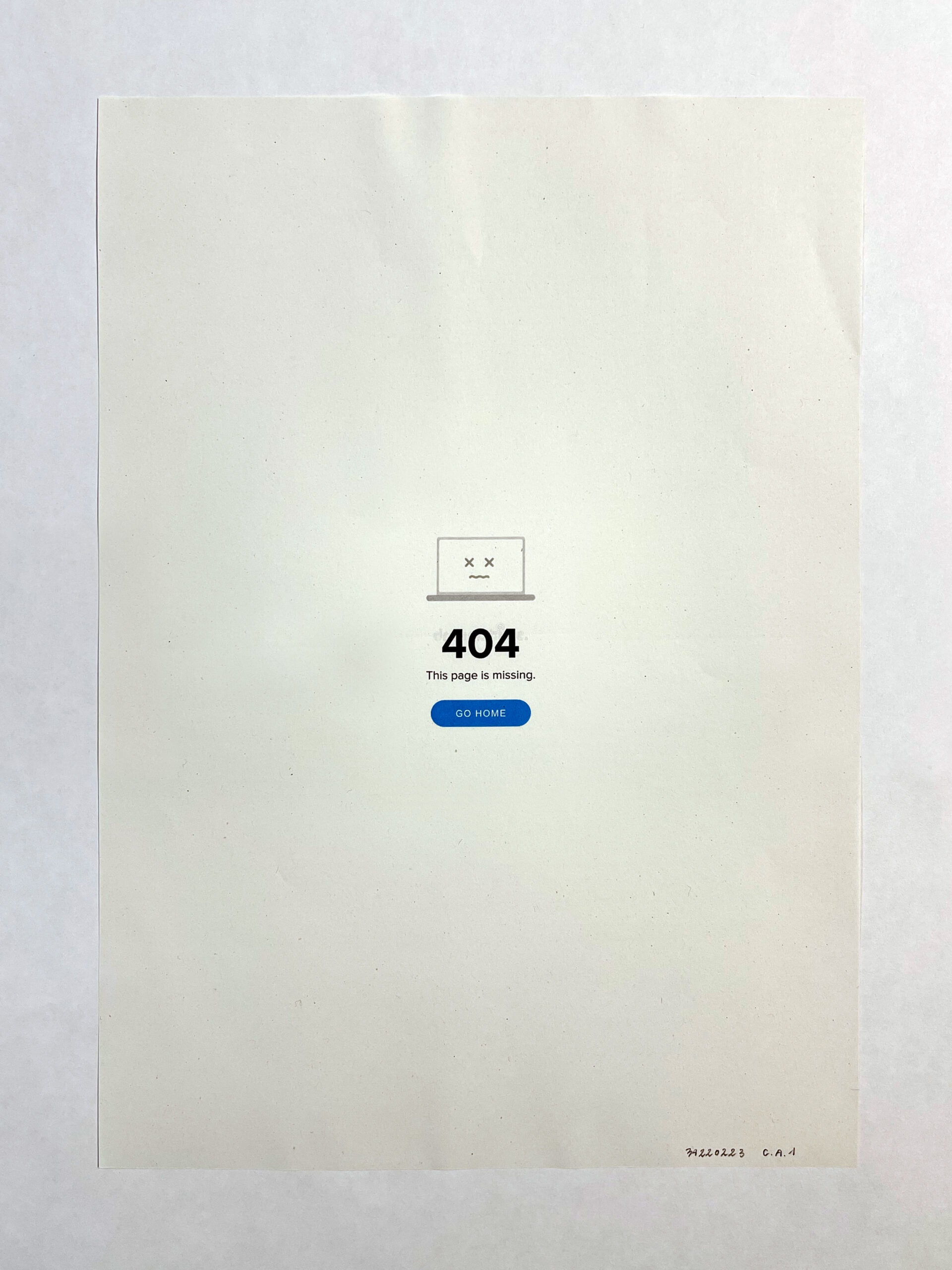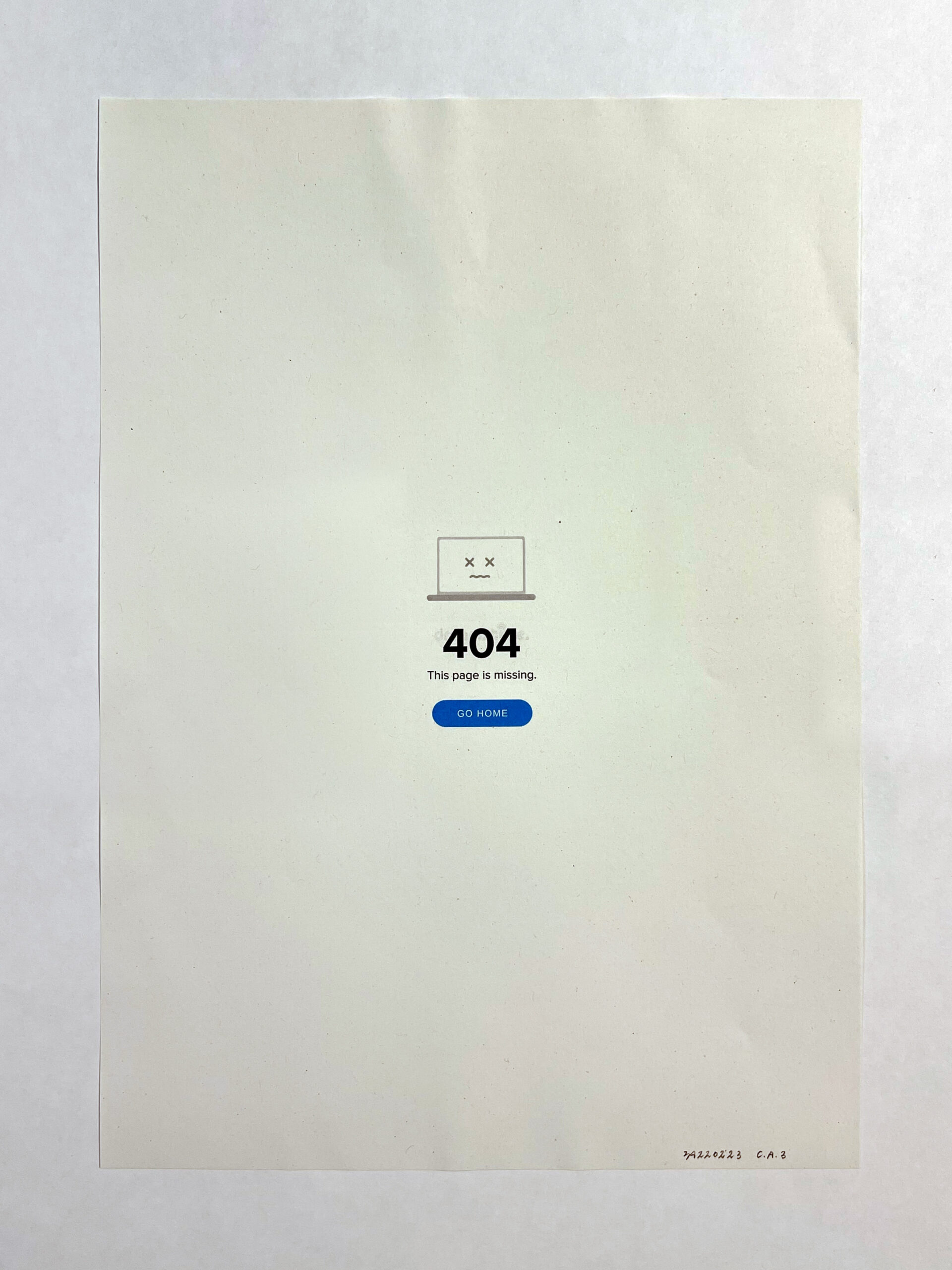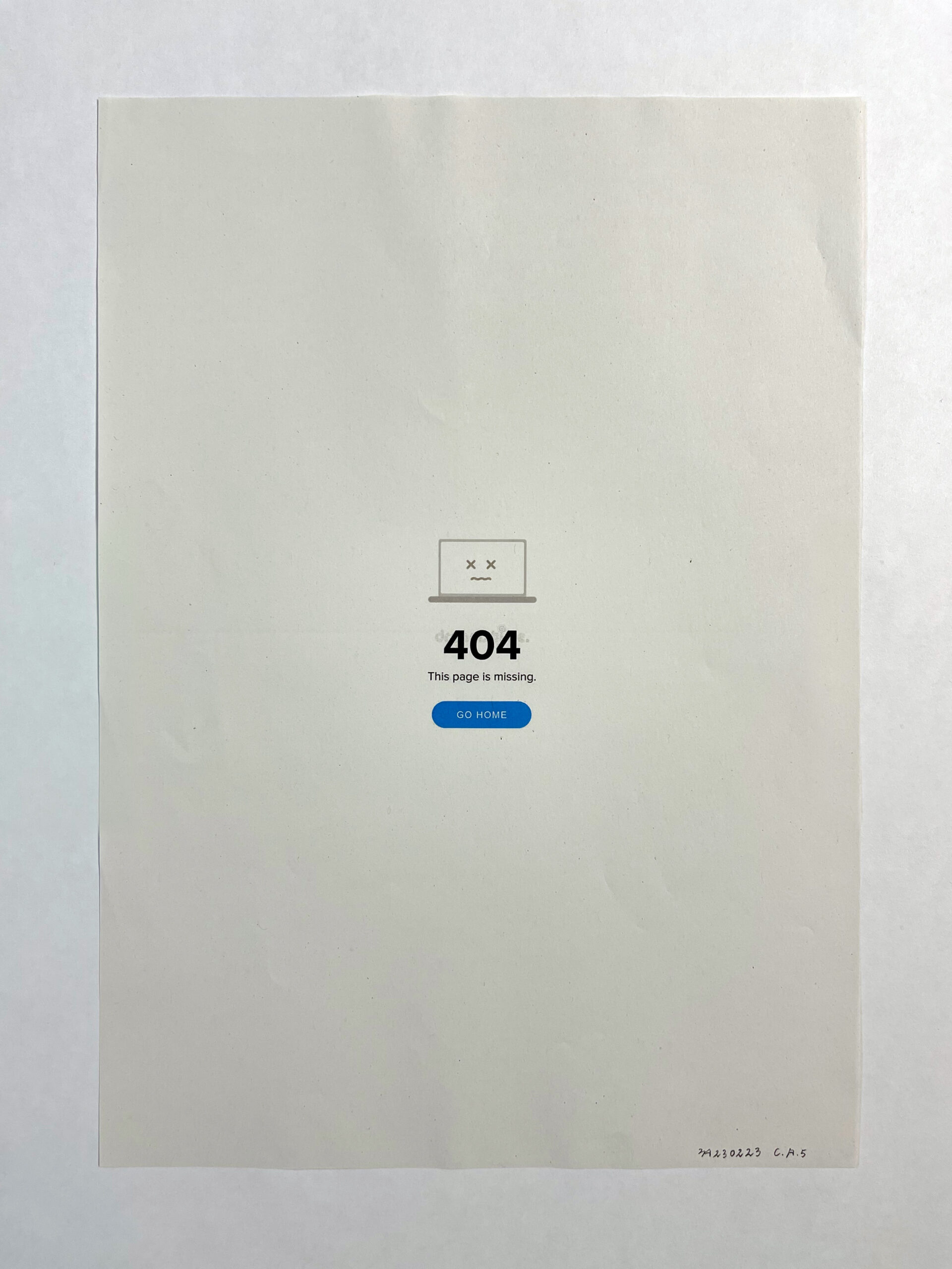 1749h Print on an A4 sheet of recycled paper, and in the center of the page, the modern example of the vector template for the 404 error page for the website not found404 page vector illustration – text illustration, alert: 94138960. Found. Located in a Google search when typing: ‘Page not found.’ The image in question is that of the symbol of an open laptop, with two ‘X’s on the screen, serving as eyes, and a wavy line beneath it, serving as a mouth. Below, centered, in large characters, and in Helvetica font, the number 404. Further down, centered, with smaller characters and the same font: ‘This page is missing.’ And even further down, a blue ‘button,’ in uppercase letters, with the same font: ‘GO HOME.’ Above the 404, there is a ‘water’ shape where one can read: dreamstime. Once this image is printed, leave the sheet abandoned in any space, indoors or outdoors. Without a signature or anything that could indicate the purpose. Time will tell and know if something coél happens. Several sheets can be printed and distributed more widely, but always clandestinely. The interpretation of this occurrence can be documented (photo, video, text, orally, etc.). An entire package of sheets can also be printed and small piles of printed sheets left at different points in a particular museum, center, or art fair, for people to take if they want, as if it were a work by Félix González-Torres or many others who use these strategies.
