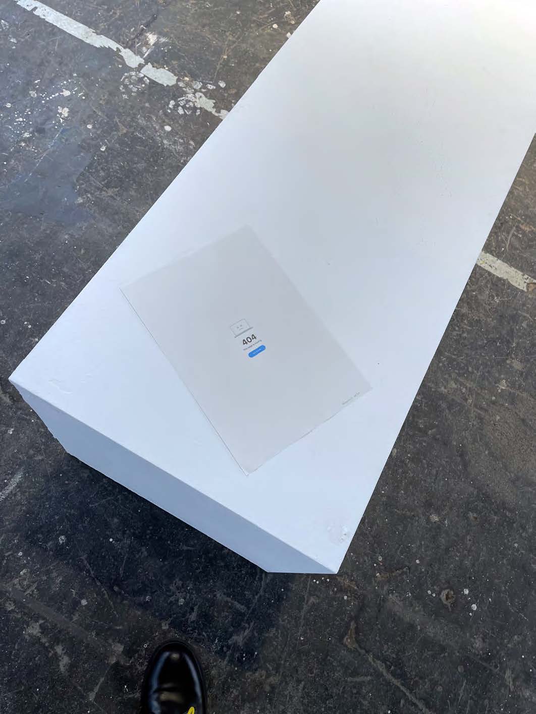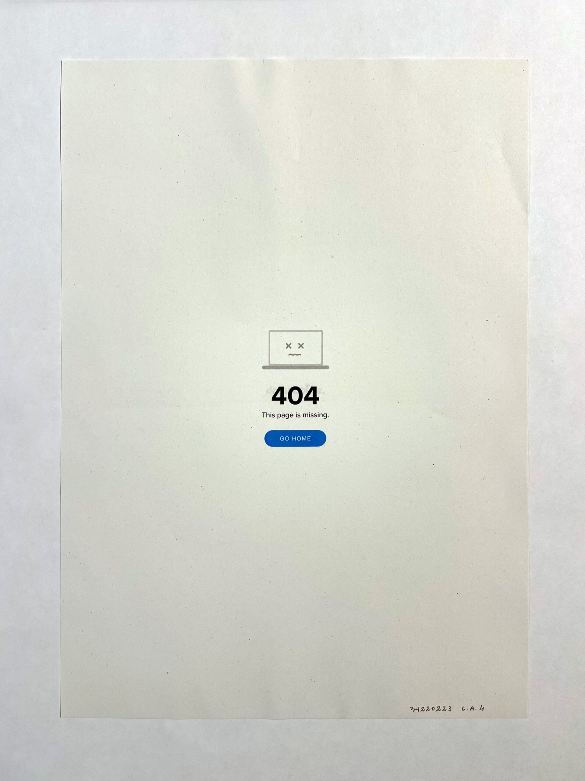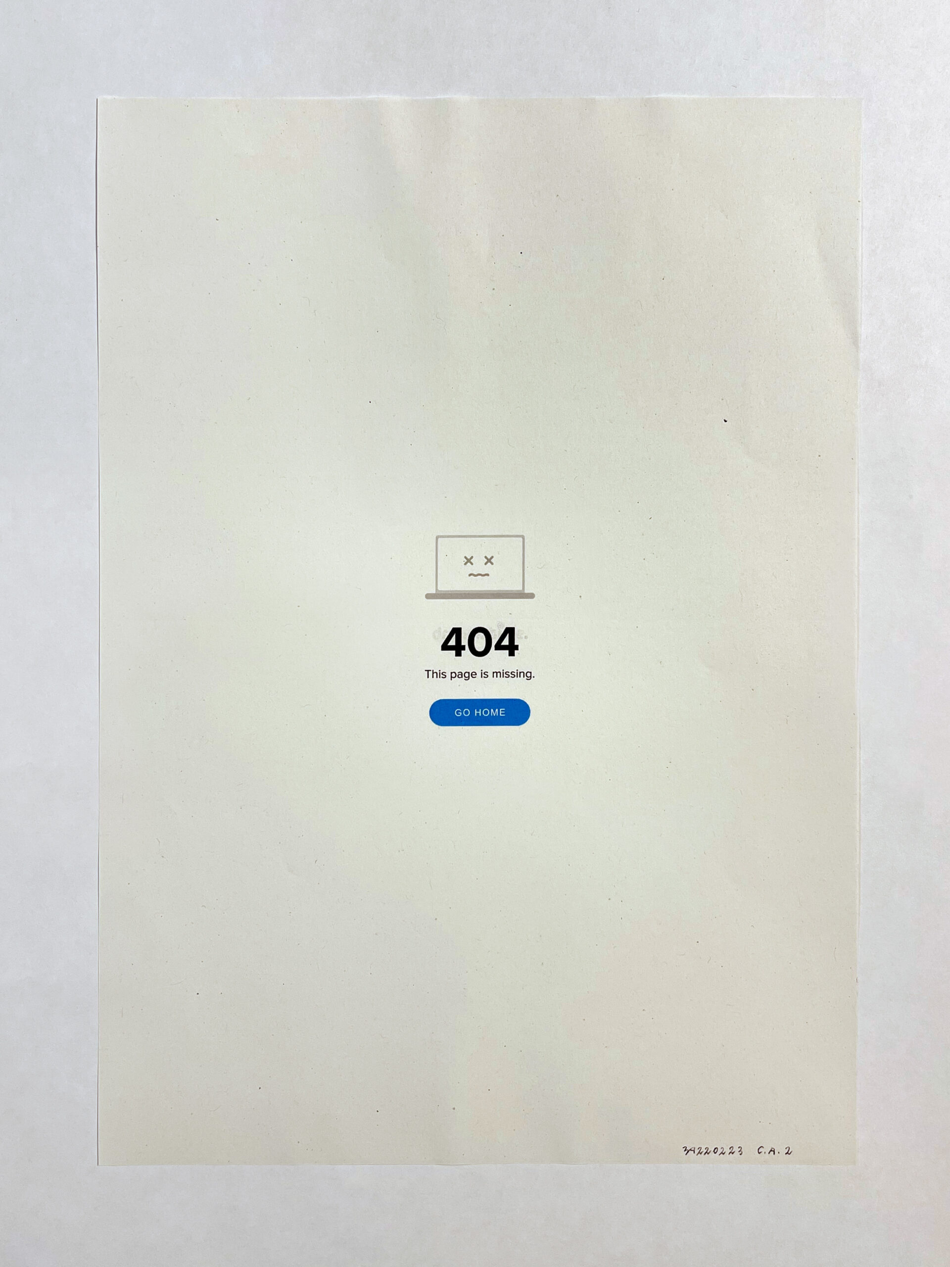 1749h Print on an A4 sheet of recycled paper, and in the center of the page, the modern example of the vector template for the 404 error page for the website not found404 page vector illustration – text illustration, alert: 94138960. Found. Located in a Google search when typing: ‘Page not found.’ The image in question is that of the symbol of an open laptop, with two ‘X’s on the screen, serving as eyes, and a wavy line beneath it, serving as a mouth. Below, centered, in large characters, and in Helvetica font, the number 404. Further down, centered, with smaller characters and the same font: ‘This page is missing.’ And even further down, a blue ‘button,’ in uppercase letters, with the same font: ‘GO HOME.’ Above the 404, there is a ‘water’ shape where one can read: dreamstime. Once this image is printed, leave the sheet abandoned in any space, indoors or outdoors. Without a signature or anything that could indicate the purpose. Time will tell and know if something coél happens. Several sheets can be printed and distributed more widely, but always clandestinely. The interpretation of this occurrence can be documented (photo, video, text, orally, etc.). An entire package of sheets can also be printed and small piles of printed sheets left at different points in a particular museum, center, or art fair, for people to take if they want, as if it were a work by Félix González-Torres or many others who use these strategies.